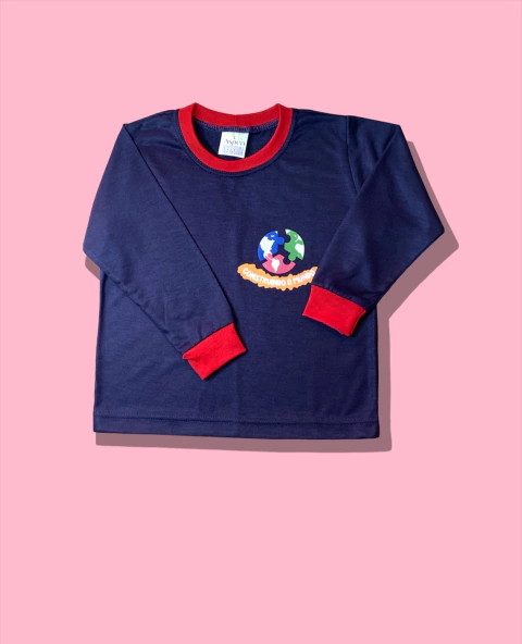 A gola e o punho são em ribana de PV e o logo é serigrafado, ao invés de bordado, para não incomodar no peito da criança.